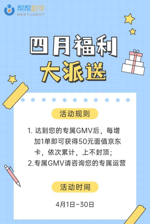 已入驻帮帮助学平台的的机构,只要达到既定GMV(阶段交易额)后,每新增一笔非金融分期交易订单,即可获赠帮帮助学赠送的50元面值京东卡,成单越多,奖励越多,上不封顶!