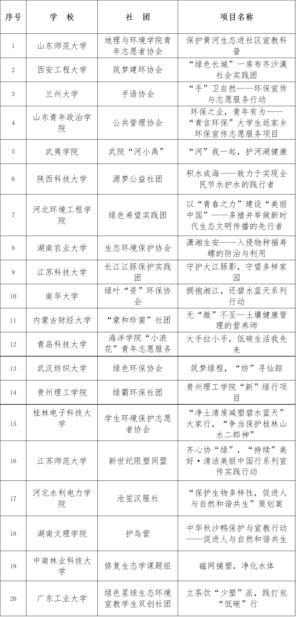 2023年“清洁美丽中国行”全国高校小额资助项目入围名单