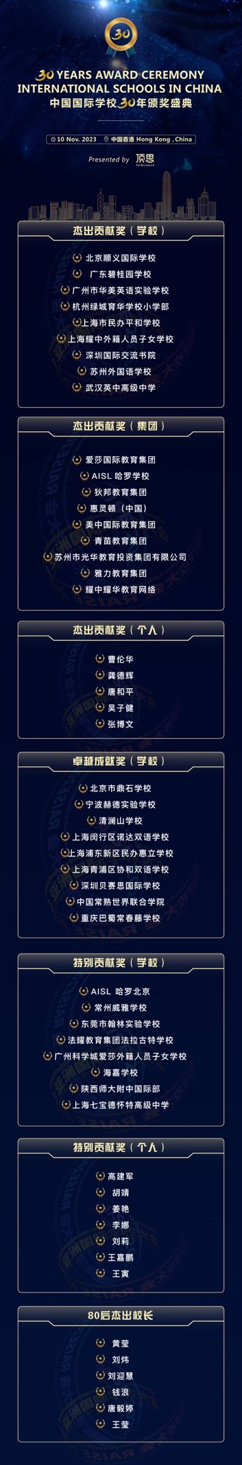 国际化素养、全球化视野、全人教育、个性化成长……这些教育热词承载着中国无数家庭、学校、孩子们的梦想。这30年来,人们对素质教育的探索从未停歇。自1993年起,国际化学校在中国如雨后春笋。时至今日已走过30年。在素质教育实践,多元化升学,支持个性化成长等方面开启了一片全新天地,用行动积极回应国家教育改革。11月10日,来自全球的教育精英齐聚中国香港,一起见证一场国际教育界“奥斯卡颁奖”,一起回首30年鲜为人知的教育往事和教育工作者潜心耕耘的足迹。