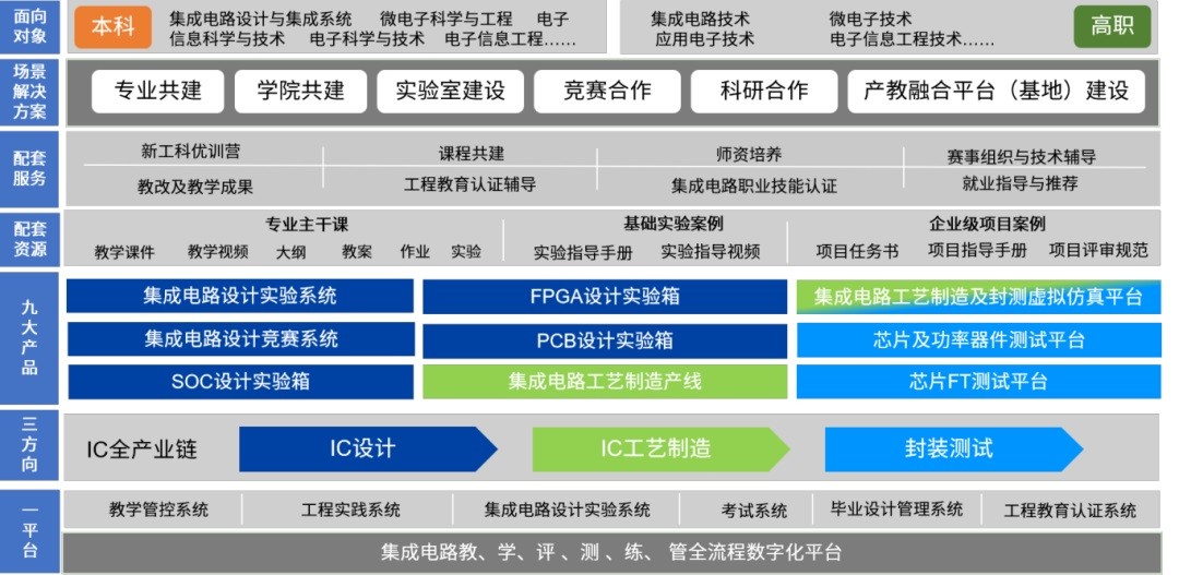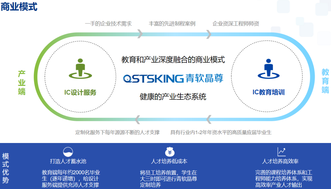 教育培训业务始于2006年,利用平台+内容+服务的模式助力高校集成电路人才培养,一方面将产业端的新技术、新工艺、新需求经过研发转化,为教育端提供符合当下技术发展的教育培养体系,协助高校提升教育服务产业能力;另一方面将教育端培养的高质量人才源源不断的输送到产业,从而解决产业端用人问题,降低用人成本。