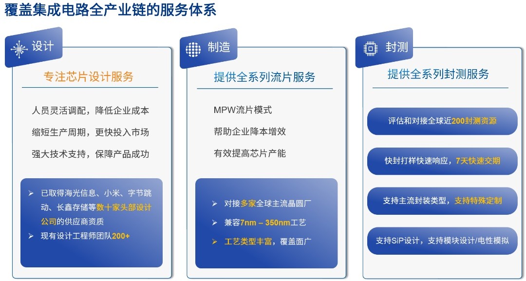 集成电路设计服务始于1996年,为国内较早从事集成电路设计服务的企业,产品涵盖DDR存储类芯片、RFIC、MCU、电源管理、LCD/OLED液晶驱动、蓝牙耳机IC等不同功能芯片,工艺制程涵盖TSMC、GF、UMC、SMIC、DB、XFAB等主流工艺厂商500nm~7nm之间的各类工艺。
