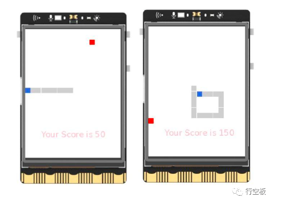 通过Mind+软件中的Python编程工具,借助pygame库设计贪吃蛇小游戏,在行空板屏幕上显示游戏界面,使用板载AB按键控制游戏角色在屏幕上移动,实现贪吃蛇游戏功能。