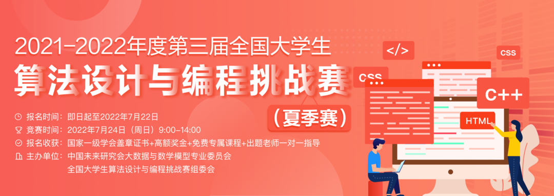 为了响应教育部对人工智能、大数据专业人才培养的倡导,中国未来研究会大数据与数学模型专业委员会决定举办2021-2022年度第三届全国大学生算法设计与编程挑战赛(夏季赛)。旨在激发学生学习计算机领域专业知识与技能的兴趣,鼓励学生主动灵活地运用计算机知识和技能解决实际问题,有效提升算法设计、逻辑推理、数学建模、编程实现和计算机系统能力,培养团队合作意识、挑战精神和创新能力。欢迎各高等院校按照参赛规则及有关规定组织同学报名参赛。