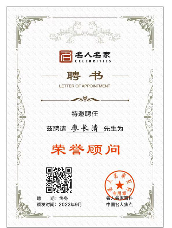 廖长清,中国当代名医,全国著名肝病专家,中华名医理亊会副会长。少年师承中医,从医50年专治肝炎、肝硬化、肝癌、糖尿病,学验具丰。多年来使无数肝硬化患者转危为安,重获新生。2016年国务院新闻办,中国网新闻中心以《攻克医学难关肝硬化,廖长清开创了肝硬化、肝癌治疗新纪元》,通过中国网,央视网发布。同年在北京人民大会堂,参加“第四届中国主任医师学术年会”,受到了第九届全国人大副委员长、两院院士吴阶平,卫生部副部长蒋作君,中国医师协会会长殷大奎等领导的亲切接见。并作了《揭开乙肝无法转阴的神秘面纱》的大会发言,获得优秀论文二等奖,并载入《中国当代思想宝库》一书。发表有论文10多篇,编著有《肝病的禁忌与营养》、《肝硬化的形成与治疗》、《科学吃水果疾病远离我》等书。多次接受中央电视台专访。2020作为中医药行业杰出代表被中国影响力人物数据库收录,永载史册!2022年作为著名肝病专家被中国名人焦点网-名人名家百科收录,并授予“行业影响力领军人物”称号
