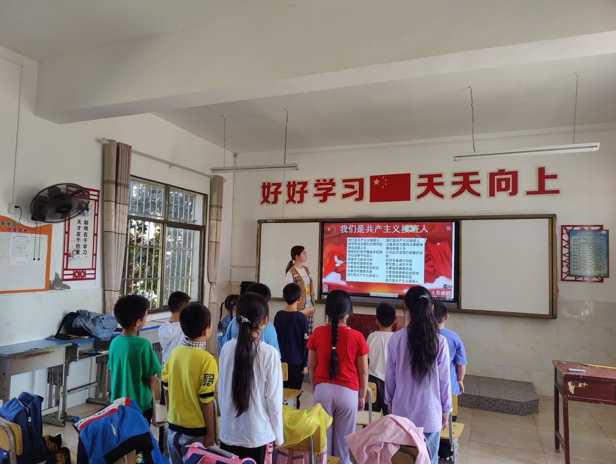 图为志愿者在一年级教室带着孩子们唱红歌