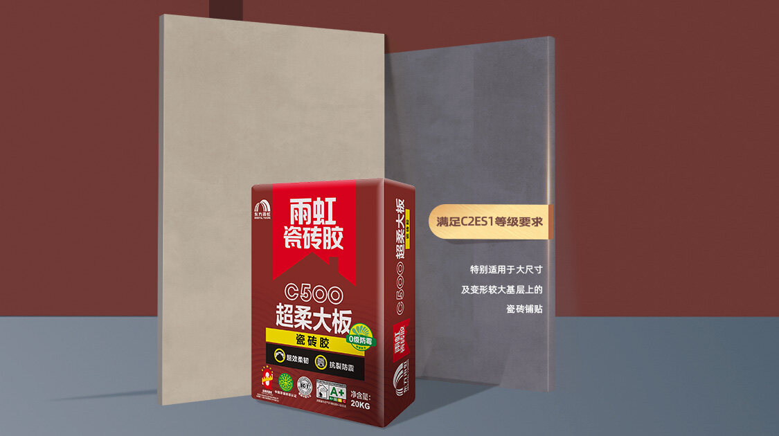 在选完瓷砖胶品牌之后,还需根据瓷砖尺寸来选择合适的瓷砖胶产品。尺寸大的瓷砖应该选择粘结力强的瓷砖胶。我们可以通过看执行标注判断瓷砖胶的粘结力。一般而言,执行JC/T 547-2017《陶瓷砖胶粘剂》C2标准的瓷砖胶可以满足大板瓷砖的铺贴需求,推荐雨虹C500超柔大板瓷砖胶,粘结强度高达1.9-2MPa(实验室标准测试),最大可以贴1200mm×2400mm的瓷砖。