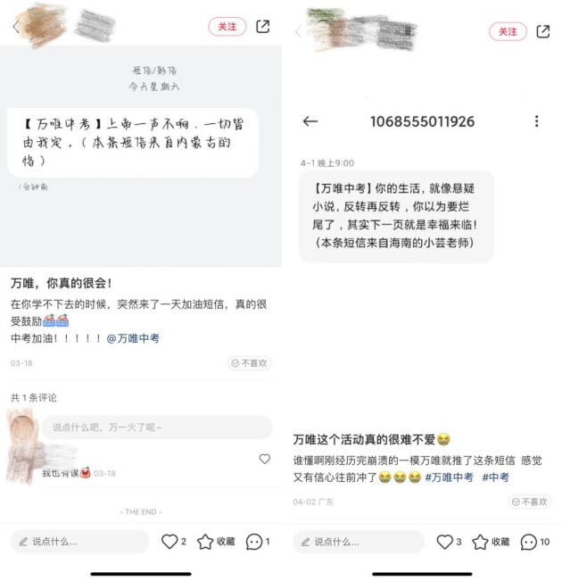 为帮助中考生做好考前心理调整,平衡心态、缓解压力,同时给他们加油鼓劲,从考前100天开始,万唯每周给志愿报名的学生发送加油短信,鼓励他们坚韧、积极、自信地备考。