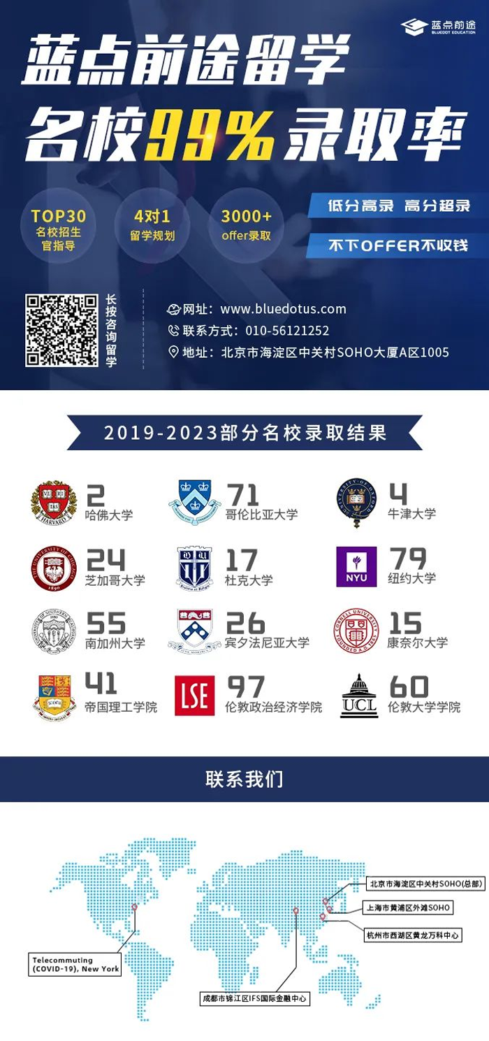 北京蓝点前途留学机构主要从事美国、英国、加拿大、澳大利亚、新加坡、中国香港和澳门等地区的本科、研究生申请以及各项语言成绩的提分指导。同时还提供中小学、高中生出国指导和后续生活管家式服务,让留学生们轻松享受陪伴式的出国留学服务。在全球一体化的时代背景下,蓝点前途留学将主动担负起时代赋予的使命,为国家培养具有国际视野、家国情怀的国际化人才提供助力。多年来,蓝点前途留学致力于帮助有志于进入美国名校接受精英教育的大陆学子完成梦想,成为华人精英。
