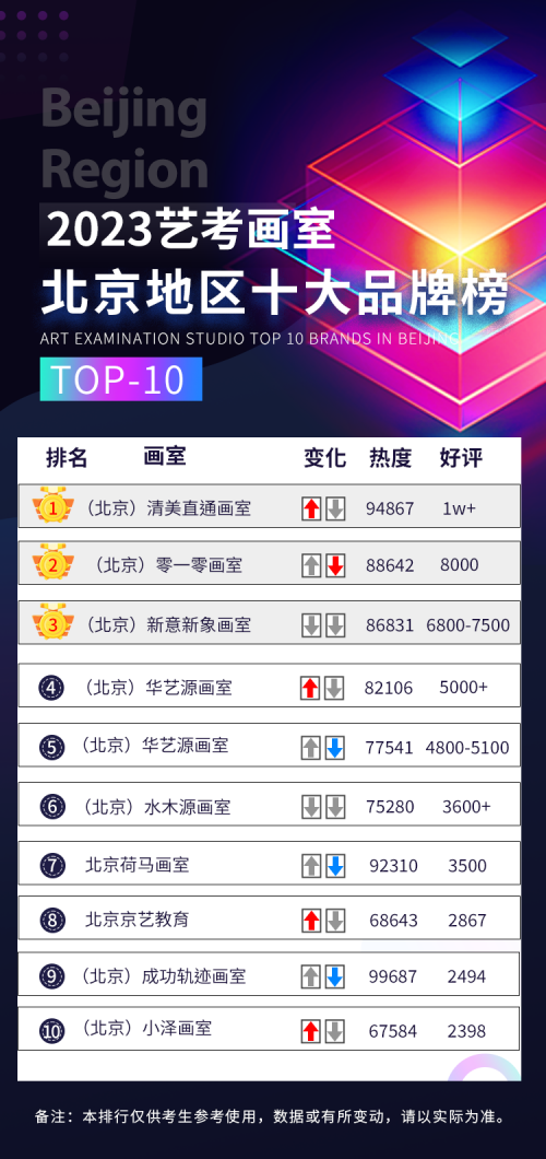 可以看出这十家画室总体水平是北京较好的,从整体数据来看画室的排名是有5名之内的浮动的,这和每一年的艺考分数线和学生的总体录取成绩是息息相关的,据小编了解到每一家画室都有自己的定位和风格,比如清美直通主要打造想上清华的众多学子,所以招收门槛一般都在文化课能达到500左右的学霸级别,另外像水木源画室、成功轨迹画室和荷马画室都是规模比较大的且在全国都有连锁画室,当然生源一定会比其他画室要多,人数基数大未免会影响到总体的成绩和口碑,所以排名浮动5名内小编认为都是合理的,今天的分享就到这了,希望能帮助到大家,后续还会继续为大家整理画室相关的资讯!