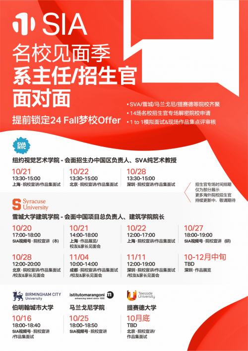 面对今年艺术留学严峻的申请形式,学生该如何应对,艺术留学机构又有哪些动作,记者采访了SIA艺术留学教研负责人,她表示,“SIA国际艺术教育为应对即将要到来的申请季,继教育巡展后,接棒开启了名校见面季系列活动,邀请到了纽约视觉艺术学院,雪城大学建筑学院,马兰戈尼学院,提赛德学院等多所英美艺术院校招生官代表和系主任,带来14场院校专场招生官见面会,此外,10月开始,SIA每周都安排了“早申冲刺专场直播”,由SIA教学教研专家为学生解读申请规划攻略,名校政策变化和专业作品集要求等。更好的为2024Fall申请的学生们助力。”
