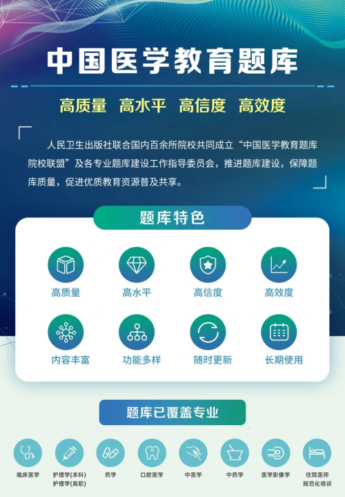 而多年来,人民卫生出版社中国医学教育题库也始终秉承着这一理念,认真贯彻执行“教考分离”政策,以规划教材为蓝本,以教材知识体系及执业资格考试大纲为框架,在命题方面注重知识点的全面覆盖和难度的合理分布,同时结合实际临床情境,重点考查学生的实践能力和解决问题的能力,为提高医学人才培养质量提供有力的支持。