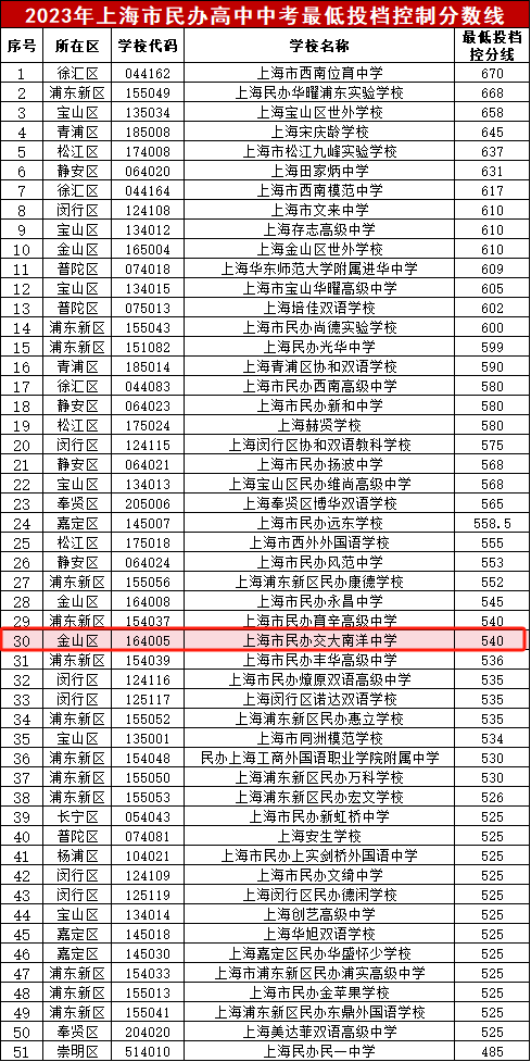 可以看出,在市教委公布的51所学校的录取分数线中,上海交大南洋中学排名第30。相比其他学校,它对学生的录取分数要求相对较低。这意味着学生在申请入学时有更多的机会被这所高中录取。