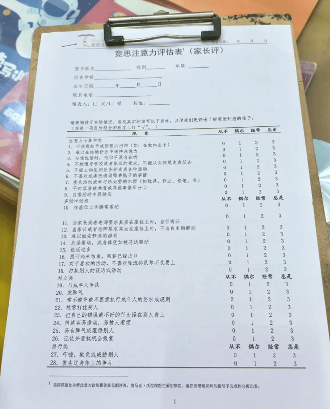 注意力评估问卷。竞思采用美国范德比尔特注意力诊断报告评测表,是目前最权威的注意力和多动评测表,家长根据孩子平时的表现如实填写,得到针对孩子各方面问题的专业评估和判断。