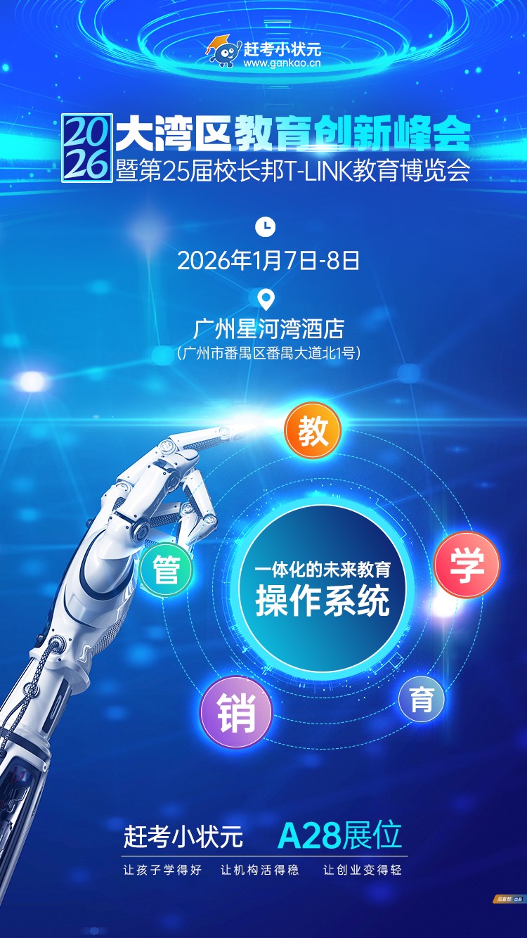 1月7日至8日,广州,校长邦T-LINK教育博览会。赶考小状元将携深耕行业20余年的思考与实践,于A28展位全面呈现 “AI驱动的一站式教育新基建”。我们不止展示产品,更呈现一种融合共生的新范式。
